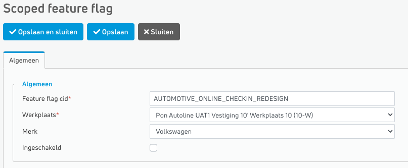Feature flags kunnen per werkplaats en merk worden in- of uitgeschakeld. Maak en koppel de volgende flags aan de betreffende werkplaats(en) en eventueel merk:
