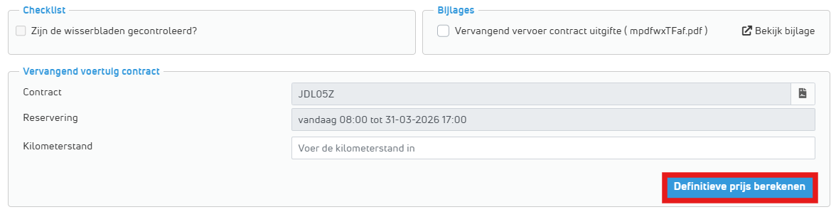 Klik op 'Check-out'. In het checkout formulier kan de definitieve prijs worden berekend (indien verplicht ook de kilometerstand ingevuld worden). |